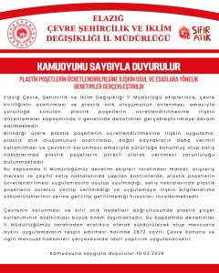 “Elazığ Çevre, Şehircilik ve İklim Değişikliği İl Müdürlüğü ekiplerince, çevre kirliliğinin azaltılması ve plastik atık oluşumunun önlenmesi amacıyla yürürlüğe konulan plastik poşetlerin Ücretlendirilmesine ilişkin düzenlemeler kapsamında il genelinde denetimler gerçekleştirilmeye devam edilmektedir.