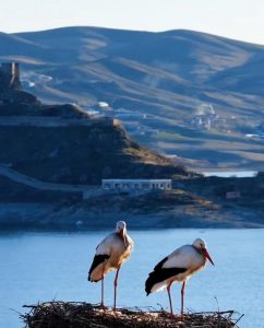 Tarihin sessiz tanığı olan kale ile doğanın en zarif misafirlerinden leyleklerin buluşması, ortaya kartpostallık görüntüler çıkarıyor. Keban Baraj Gölü’nün sakin sularına yansıyan kale silueti ve gökyüzünde süzülen leylekler, Pertek’i ziyaret edenlere unutulmaz anlar yaşatıyor.