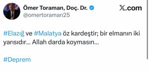 Toraman paylaşımında, “Elazığ ve Malatya öz kardeştir; bir elmanın iki yarısıdır… Allah darda koymasın…” ifadelerini kullanarak iki şehir arasındaki dayanışma kültürünü ön plana çıkardı.