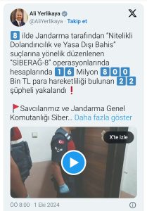 İçişleri Bakanı Ali Yerlikaya, savcıların ve Jandarma Genel Komutanlığı Siber Suçlarla Mücadele Daire Başkanlığı koordinesinde; İl Jandarma Komutanlıklarınca İstanbul, Antalya, Trabzon, Mersin, Van, Gaziantep, İzmir ve Eskişehir’de “Siberağ-8” operasyonlarının düzenlendiğini duyurdu.