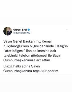Sayın Genel Başkanımız Kemal Kılıçdaroğlu’nun bilgisi dahilinde Elazığ’ın “afet bölgesi” ilan edilmesine dair talebimizi telefon görüşmesi ile Sayın Cumhurbaşkanımıza arz ettim. Elazığ halkı adına Sayın Cumhurbaşkanı’na teşekkür ederim” ifadelerini kullandı.