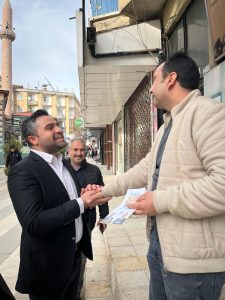 DEVA Partisi Belediye Başkan Adayı Recep Ceylan seçim çalışmalarını yoğun bir tempo ile sürdürüyor. STK ve Mahalle ziyaretlerini sürdüren Ceylan en son Bağ-Kur Caddesi ‘nde esnaf ve vatandaşlarla bir araya geldi. Esnafla gündeme ve şehrin nabzına dair sohbet eden Ceylan projelerini anlatarak destek talebinde bulundu. Değişim isteklerini belirten esnaflar ekonomik krizden ve Bağ-Kur primlerinden dolayı yaşadıkları sıkıntıları anlattılar.