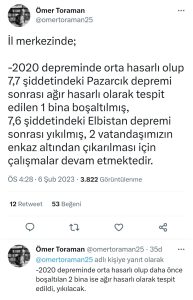 Depremden etkilenen Elazığ’da olumsuz bir ihbar alınmamıştı. Edinilen son bilgiye göre Merkez Akpınar Mahallesinde bir bina çöktü. Elazığ Valisi Ömer Toraman ağır tespiti yapılan ve boşaltılan bir binanın yıkıldığını söyledi.