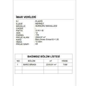 Yeni Elazığ Baro Hizmet Binası, Sürsürü Mahallesi, 178 Parsel 12 Ada Nolu alanda inşa edilecek.