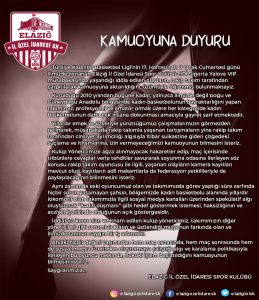 “Türkiye Kadınlar Basketbol Liginin 17. Haftasında 7 Ocak Cumartesi Günü İlimizde oynanan Elazığ İl Özel İdaresi Spor Kulübü – HDİ Sigorta Yalova VIP karşılaşması esnasında ve maç sonunda yaşandığı iddia edilen olayların, rakip takım tarafından çarpıtılarak kamuoyuna aktarıldığını üzüntüyle takip etmekteyiz.