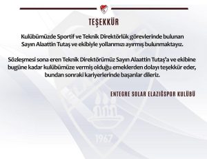 Sözleşmesi sona eren Teknik Direktörümüz Sayın Alaattin Tutaş’a ve ekibine bugüne kadar kulübümüze vermiş olduğu emeklerden dolayı teşekkür eder, bundan sonraki kariyerlerinde başarılar dileriz.” denildi.