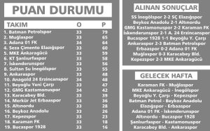 Nesine 2. Lig Beyaz Grup’ta 36. Hafta maçlarının heyecanı yaşandı. Bordo-Beyazlı ekibimizin takıldığı haftaiçi maçları sonunda Batman Petrol spor şampiyonluğunu ilan ederken, Bucaspor 1928’in ardından Karaman FK küme düşen 2. takım oldu. Play-off hattında da Ankaragücü Şanlurfaspor’u geride bırakarak play-off hattına yerleşti. Şanlıurfaspor grupta 6. Sıraya geriledi.