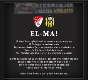 Gerek kulübümüzün ve stadımızın,gerekse evlerimizin kapıları Malatyalı hemşerilerimize sonuna kadar açıktır. Birlik ve beraberlik içinde bugünleri de atlatacağız. Çünkü bir EL-MA’nın yarısıyız.