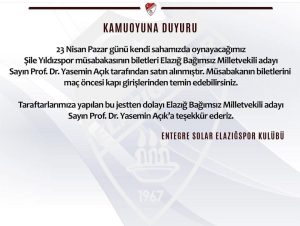 Elazığspor Kulübü’nden yapılan teşekkür mesajında; “23 Nisan Pazar günü kendi sahamızda oynayacağımız Şile Yıldızspor müsabakasının biletleri Elazığ Bağımsız Milletvekili Adayı Sayın Prof. Dr. Yasemin Açık tarafından satın alınmıştır. Müsabakanın biletlerini maç öncesi stadyum kapı girişlerinden temin edebilirsiniz. Taraftarımıza yapılan bu jestten dolayı Elazığ Bağımsız Milletvekili Adayı Sayın Prof. Dr. Yasemin Açık’a teşekkür ederiz” denildi.