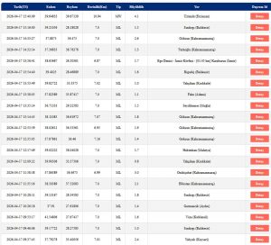 Kandilli Rasathanesi ve AFAD tarafından paylaşılan son depremler listesi, vatandaşların bulundukları bölgelerde hissedilen sarsıntıları kontrol etmeleri açısından önem taşıyor. Türkiye’nin aktif fay hatları üzerinde bulunması nedeniyle gün içinde farklı bölgelerde küçük ve orta büyüklükte depremler yaşanmaya devam ediyor.