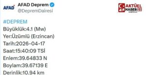 AFAD verilerine göre 17 Nisan 2026 tarihinde saat 15.40’ta Erzincan’ın Üzümlü ilçesinde 4.1 büyüklüğünde bir deprem meydana geldi. Yerin yaklaşık 10.94 kilometre derinliğinde gerçekleşen sarsıntı, çevre ilçelerde de hissedildi.