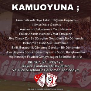 “Asrın felaketi diye tabir ettiğimiz deprem 11 ilimizi yıkıp geçmiş analarımız babalarımız çocuklarımız enkaz altında kalarak vefat etmişken ülke olarak zor bir süreçten geçtiğimiz bu dönemde birbirimize daha sıkı sarılmamız birlik beraberlik olmamız gereken bir dönemde ayrı düşmek spora siyaset,siyasete sporu karıştırmanın hiç kimseye faydası olmayacağını belirtmek isteriz.