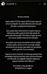 Yaşanan gelişmelerin ardından programında değişikliğe gitmek zorunda kalan Emre Fel, Adana’da gerçekleştirmeyi planladığı konserini pazar gününe ertelediğini açıkladı. Bu değişiklik nedeniyle mağduriyet yaşayanlardan özür dileyen şarkıcı, turne programının ise devam edeceğini belirtti.