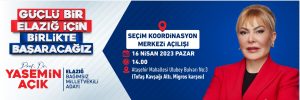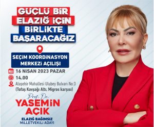 Elazığ Bağımsız Milletvekili Adayı Prof.Dr Yasemin Açık’ın 16 Nisan Pazar günü saat 14:00’da Seçim Koordinasyon Merkezi Açılışı gerçekleşecek. “Güçlü bir Elazığ için Birlikte Başaracağız” sloganıyla yola çıkan Açık’ın seçim koordinasyon merkezi açılışına tüm halk davetlidir.