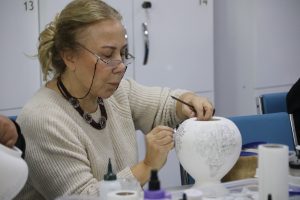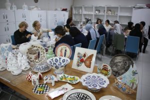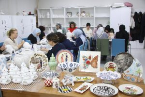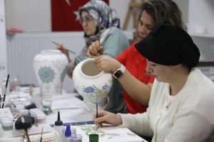 Merkezi’nde faaliyetlerini sürdüren çini işlemeciliği kursu, ücretsiz olarak kadınlarımıza hizmet veriyor.