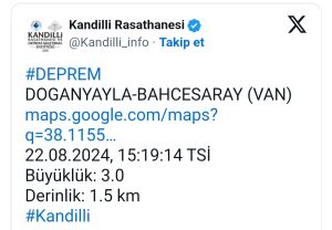 Kandilli Rasathanesi, Van’ın Bahçesaray ilçesinde 3 büyüklüğünde bir depremin meydana geldiğini duyurdu.