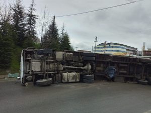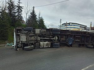 Kocaeli Dilovası tavşanlı yönünden İstanbul’a giden Tır havanın yağmurlu oluşu ve kayganlaşan yololun oluşu nedeniyle tır şoförü virajı alamayıp konteynerı yola devirdi.Tır şoförü yararlanarak hasteneye kaldırıldı olayla ilgili soruşturma başlatıldı .