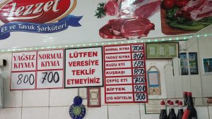 1 kilo kıyma. 700.TL 1 kilo kusbaşı et 850 TL. Kuzu eti 650. TL. Çepiç eti. 700 TL. 1 kilo dana sucuk 700 TL fiyatlarımız yıl sonuna kadar geçerlidir