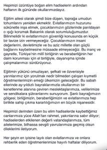 “Hepimizi üzüntüye boğan elim hadiselerin ardından haftanın ilk gününde okullarımızdayız.