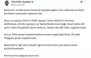 Şanlıurfa ve Kahramanmaraş’ta art arda yaşanan okul saldırıları Türkiye’yi ayağa kaldırırken, yaşanan olayların ardından Emniyet Genel Müdürlüğü de düğmeye bastı.Saldırılarla ilgili olarak 83 şahıs hakkında gözaltı kararı verilirken, 940 sosyal medya hesabına erişim engeli getirildi ve 93 Telegram grubu da kapatıldı.