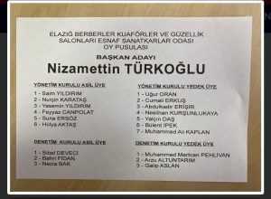 Elazığ Berberler, Kuaförler Ve Güzellik Salonları Odası Genel Kurulu’nda Başkanlığa Yeniden Nizamettin Türkoğlu seçildi. Türkoğlu; destek veren herkese teşekkür etti.