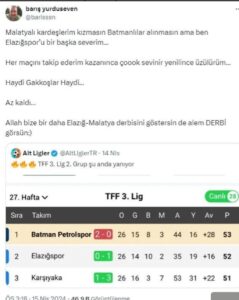 “Malatyalı kardeşlerim kızmasın Batmanlılar alınmasın ama ben Elazığspor’u bir başka severim… Her maçını takip ederim kazanınca çoook sevinir yenilince üzülürüm… Haydi Gakkoşlar Haydi… Az kaldı… Allah bize bir daha Elazığ-Malatya derbisini göstersin de alem DERBİ görsün:)”