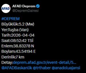 Afet ve Acil Durum Yönetimi Başkanlığı (AFAD) verilerine göre, saat 08.52’de Van’ın Tuşba ilçesinde deprem oldu. Depreminde 7 kilometre derinlikte gerçekleştiği öğrenildi.