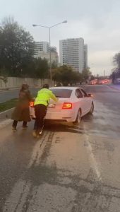 Elazığ’da seyir halindeyken otomobili bozulan kadın sürücünün yardımına trafik polisleri yetişti. Yolu kapatan ekipler, aracı iterek yol kenarına aldı.
