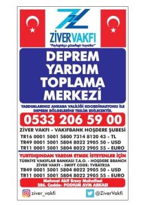 Ülkemiz de ve yurt dışında yaşayan vatandaşların Ziver Vakfı üzerinden depremzede vatandaşlara yardımlarının ulaşabilmesi için gerekli çalışmalar yapan Ziver Vakfı, çeşitli giysi, battaniye, gıda yardımları için Ankara’da Mehmet Akif ERSOY Mahallesi, 286. Cadde- Podyum AVM arkasına getirebilecek, kargo yoluyla da gelen giysi ve çeşitli yardımları Ziver Vakfı ekipleri deprem bölgelerine ulaştıracak. Yurt içi ve Yurt dışından gelen para yardımları için de çeşitli çalışmalar yapan Ziver Vakfı, sosyal medya hesaplarından para yardımı etmek isteyen vatandaşlar için iban ve hesap numaralını paylaştı.